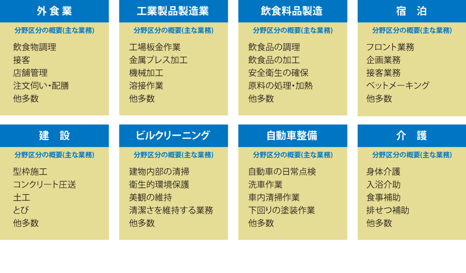 特定技能1号の主な分野の仕事の内容 (職種別技能検定の種類)